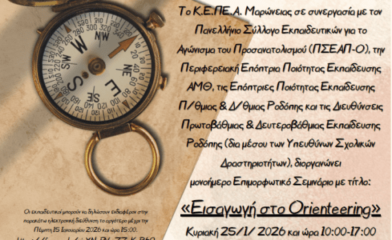 Το Κέντρο Εκπαίδευσης για το Περιβάλλον και την Αειφορία (ΚΕΠΕΑ) Μαρώνειας, στο πλαίσιο πράξης «Κέντρα Εκπαίδευσης για το Περιβάλλον και την Αειφορία (Κ.Ε.ΠΕ.Α.)» με κωδικό ΟΠΣ 6004470 στο Πρόγραμμα «Ανθρώπινο Δυναμικό και Κοινωνική Συνοχή 2021 – 2027», η οποία συγχρηματοδοτείται από την Ευρωπαϊκή Ένωση (Ευρωπαϊκό Κοινωνικό Ταμείο – Ε.Κ.Τ.+) και […]